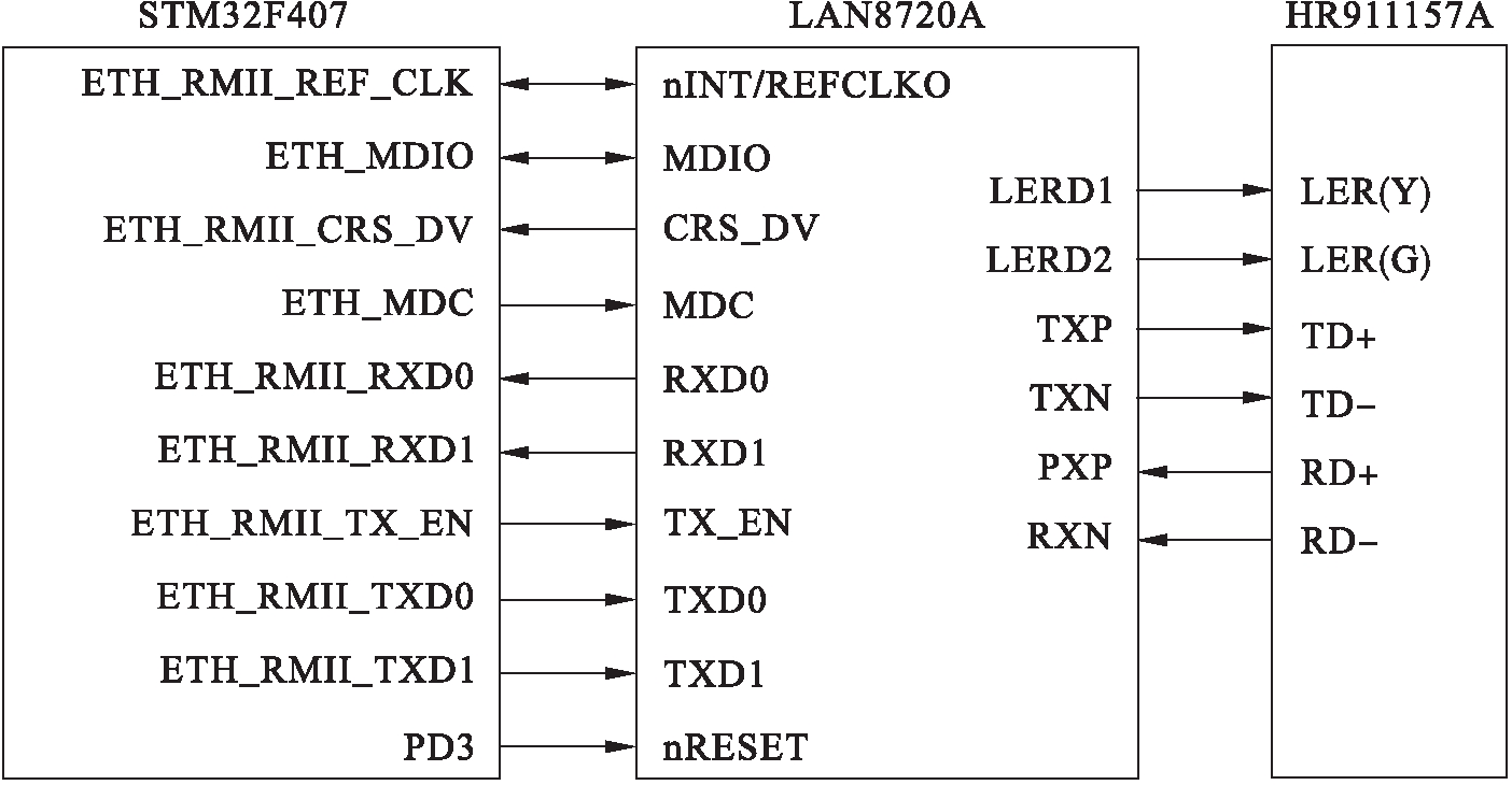 在网络接口结构中,STM32F407的MCU采用了Cortex M4内核,具有良好的控制功能和数字信号处理能力.此外,MCU集成了相应的网络模块,使用RXD0与RXD1接收数据、使用TXD0与TXD1发送数据、使用TX_EN发送启用新号.利用MDC与MDIO接口访问芯片LAN8720A的所有PHY寄存器,同时使用RMII接口与外部的PHY芯片进行通信.LAN8720A是一种低功耗物理层芯片,其I/O引脚电压符合IEEE802.3-2005标准.利用nINT/REFCLKO接口为MCU提供50 MHz时钟,同时使用RMII接口与互联网的MAC层进行通信.