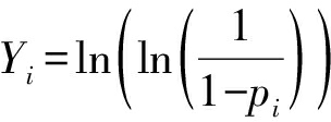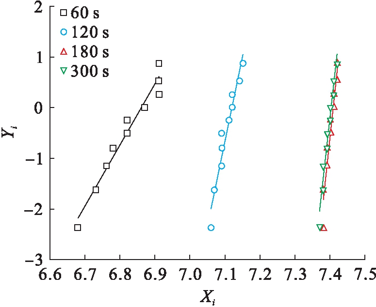 式中:Xi和Yi分别为Weibull分布函数中的两个不同参数;Ei为每个样品的电击穿强度;i为样本序号;n为样品总数;pi为对应样品在Ei电场下被击穿的概率.根据Weibull分布函数公式可知,Xi和Yi呈线性关系,拟合直线与Yi=0处轴线的截距为电击穿强度的平均值.