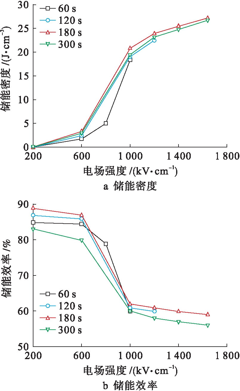 根据图5中的电滞回线与式(4)、(5)分别计算微波照射不同时间后PZO薄膜的储能密度和储能效率.图6为PZO薄膜的储能密度和储能效率随外加电场的变化规律.由图6可见,PZO薄膜的储能密度在发生反铁电相铁电相转变时迅速增加,随后在铁电极化趋近于饱和时开始缓慢增加.由于在高场强下极化强度的变化表现出滞后性,因而PZO薄膜的储能效率随着外加电场的增大而减小.当微波照射时间为180 s时,PZO薄膜的储能密度在1 640 kV/cm电场下达到27.3 J/cm3,储能效率达到59%,表现出良好的储能性能.
