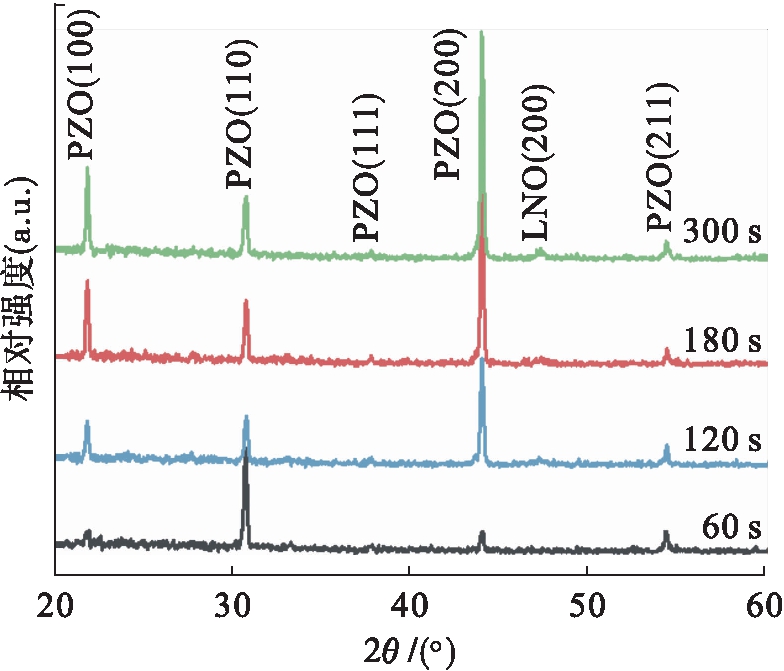图2为微波照射不同时间后PZO薄膜的XRD图谱.由图2可见,所有PZO薄膜均结晶为钙钛矿相,未检测出第二相.微波照射60 s后,钙钛矿相衍射峰是随机取向的.当微波照射时间增加到120 s时,(110)面衍射强度下降,而(100)面和(200)面衍射强度小幅度增加.当微波照射时间增加到180 s时,(100)面和(200)面衍射强度迅速增加,因而PZO薄膜表现出高度择优取向特征.当微波照射时间进一步增加到300 s时,钙钛矿相衍射峰几乎未变化,说明在微波照射180 s后PZO薄膜已经完全结晶为钙钛矿相.因此,利用微波照射只需要180 s就可以获得钙钛矿相PZO薄膜.