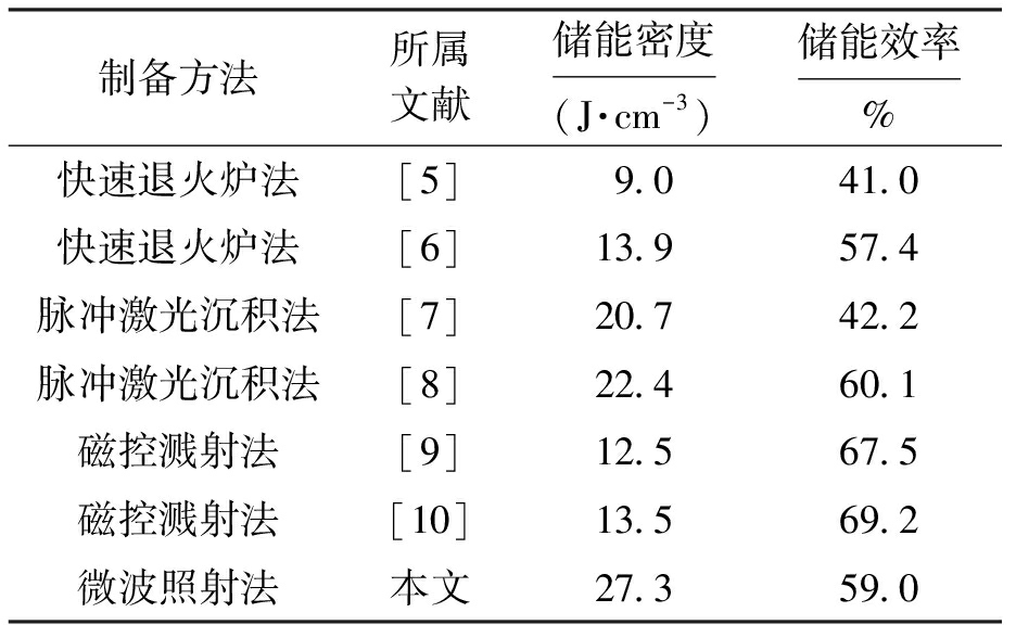 制备方法所属文献储能密度(J·cm-3)储能效率%快速退火炉法[5]9.041.0快速退火炉法[6]13.957.4脉冲激光沉积法[7]20.742.2脉冲激光沉积法[8]22.460.1磁控溅射法[9]12.567.5磁控溅射法[10]13.569.2微波照射法本文27.359.0