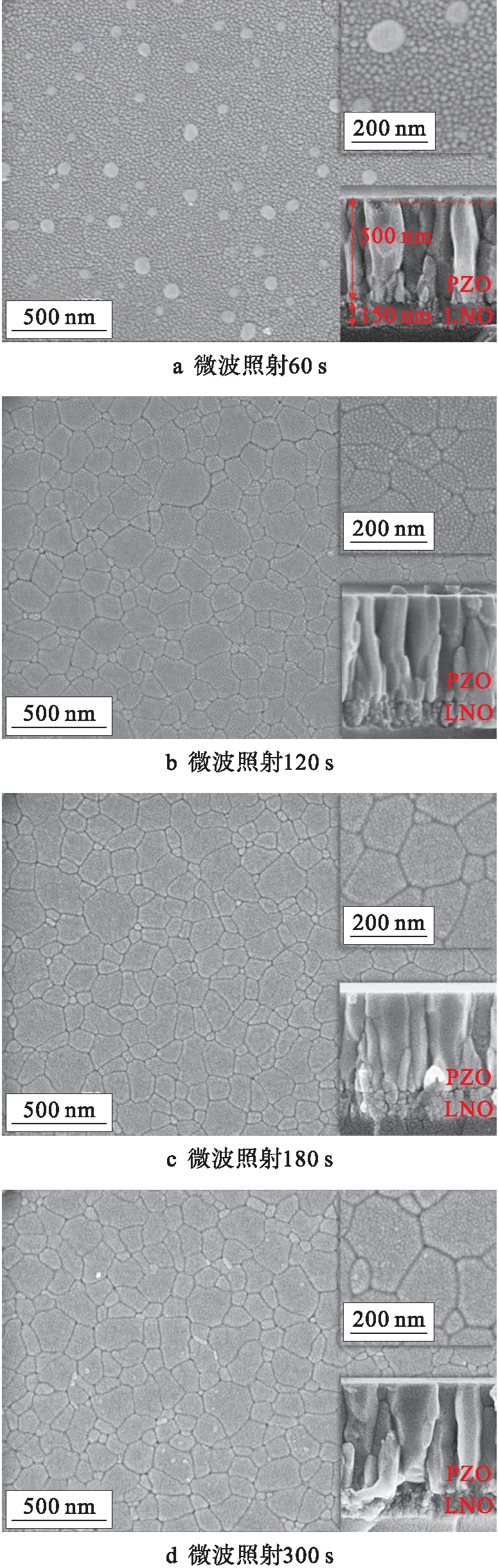 图3为微波照射不同时间后PZO薄膜的表面和截面形貌.由图3可见,PZO薄膜呈现柱状晶粒结构,厚度约为500 nm,LNO薄膜厚度约为150 nm.微波照射60 s后,由于PbO保护层未完全挥发掉,因而在薄膜表面仍然存在少量PbO颗粒.此外,薄膜表面被粒径大小约为20 nm的细小晶粒覆盖,且该细小晶粒只存在于薄膜表面,厚度约为30 nm,而绝大部分薄膜基体为柱状晶结构.当微波照射时间增加到120 s时,薄膜表面可以观察到大晶粒的生成,其粒径尺寸约为130 nm,但仍有部分小晶粒存在于大晶粒表面.当微波照射时间增加到180 s时,小晶粒区域消失,大晶粒结构已完全布满了整个薄膜表面,且晶粒非常清晰,此时PZO薄膜的柱状晶粒结构已贯穿整个薄膜.当微波照射时间进一步增加到300 s时,薄膜表面和截面形貌几乎未发生变化.上述微结构随着微波照射时间的变化规律与XRD结果相对应.