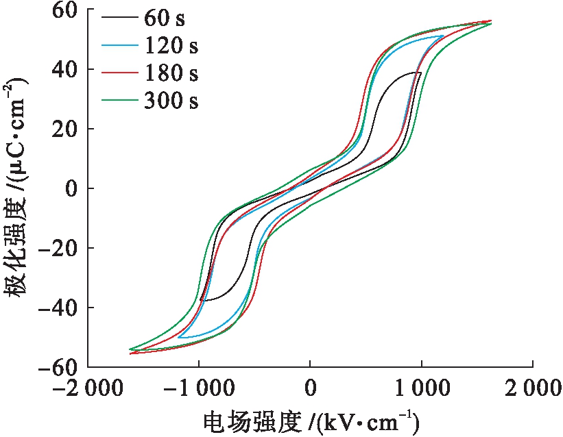 图5为微波照射不同时间后PZO薄膜的极化电场电滞回线.由图5可知,随着微波照射时间的增加,PZO薄膜的最大极化强度逐渐增大,且剩余极化强度几乎不变.当微波照射时间为60 s和120 s时,由于此时钙钛矿相和烧绿石相同时存在,PZO薄膜具有较小的电击穿强度,因而在外加电场下薄膜未能实现饱和极化前便被击穿,从而表现出较低的最大极化强度.当微波照射180 s后,PZO薄膜已经完全结晶为钙钛矿相,可以被完全极化,在外加电场1 640 kV/cm下其饱和极化强度可达57 μC/cm2.微波照射300 s后的PZO薄膜微结构变化不大,因而其对应的电滞回线几乎不发生变化.综上所述,在750 ℃条件下通过微波照射180 s就可以获得具有良好铁电性能的PZO薄膜.