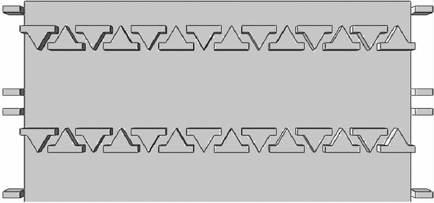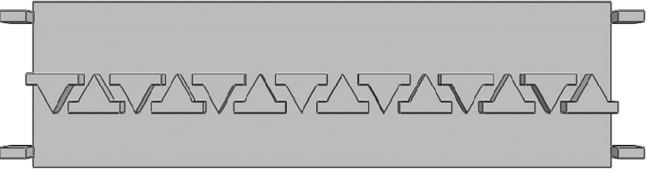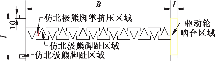 通过对北极熊的熊爪进行研究,对履带板形态进行仿生设计,履带板花纹的三角形区域和两侧的啮合部分相当于北极熊熊爪的脚趾区域,使履带板轻易地扎入积雪来增大附着力.履刺中间的四边形空腔相当于北极熊的脚掌挤压部分,这种履带板在运动过程中可以限制积雪的流动,减少积雪流失,增大履带车辆在积雪路面的通过性.履带板通过销轴进行链接,履刺花纹如图2所示.