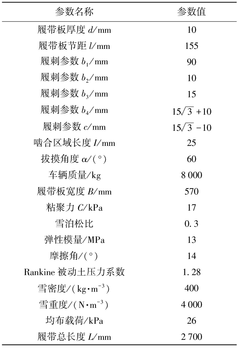 参数名称参数值履带板厚度d/mm10履带板节距l/mm155履刺参数b1/mm90履刺参数b2/mm10履刺参数b3/mm15履刺参数b4/mm153+10履刺参数c/mm153-10啮合区域长度I/mm25拔摸角度α/(°)60车辆质量/kg8000履带板宽度B/mm570粘聚力C/kPa17雪泊松比0.3弹性模量/MPa13摩擦角/(°)14Rankine被动土压力系数1.28雪密度/(kg·m-3)400雪重度/(N·m-3)4000均布载荷/kPa26履带总长度L/mm2700