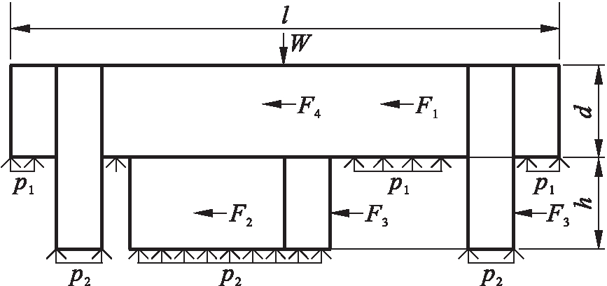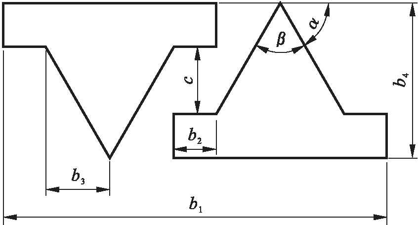 履带车辆在行驶过程中,履带板受到重力的作用发生下陷,履刺完全扎入积雪中,并发生水平方向位移.履带车辆在行驶过程中的牵引能力主要由履带板受到的牵引力决定,牵引力和土壤剪切力是一对相互作用力.通过研究履带车辆在行驶过程中受到的土壤剪切力可以得出履带车辆的通过性,积雪通常情况下被认为是一种特殊的土壤.履带车辆受到的土壤剪切力一方面取决于车辆的设计参数,另一方面取决于土壤的力学性能.由于不同土壤的力学性能差异较大,所以需要设计适用于积雪路面的履带板机构.由文献[12]及[13]可知,履带板在行驶过程中所受到的水平方向剪切力主要分为4个部分,分别为作用于履带板上的力F1,作用于履刺底部的力F2,作用于履刺和啮合部位上的力F3,作用于履带板侧面的力F4.履带板的受力如图4所示,履带板履刺结构参数如图5所示.