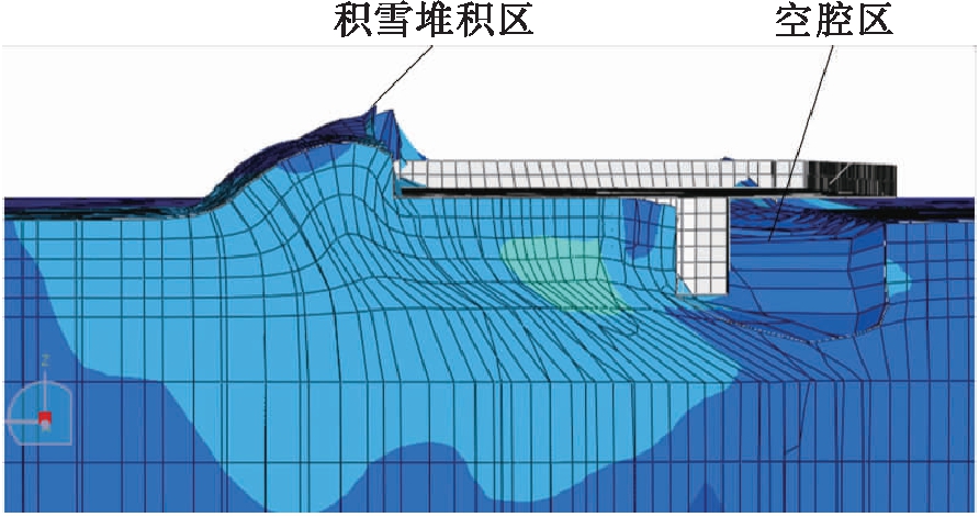 输出变量是履带板在运动过程中所受到的水平方向反作用力之和,即履带板受到的剪切力.在仿真结束时,履带板前方的积雪不断堆积在一起,正下方形成一个空腔,如图9所示,与实际情况基本一致.