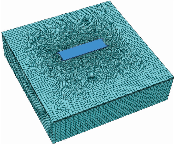 将雪的三维模型简化为弹性模型和Mohr-Coulomb塑性模型.雪模型的面积超过履带板两倍尺寸外的部分基本没有变形,因此积雪模型尺寸为长1 500 mm、宽1 500 mm、高500 mm,相关参数见表1.将履带板放置在雪模型上,限制雪四周的自由度,在第一个分析步给履带板添加接地比压让履带沉陷,在第二个分析步给履带添加Y轴正方向50 mm位移,让履带板在积雪模型上水平剪切,加密模型如图8所示.