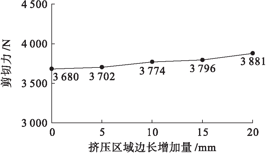 履带板的设计参数对剪切力有很大影响,为了探究挤压区域面积对履带板剪切力的影响,选用履刺高度为30 mm、履刺节距为155 mm、履刺角度为60°的无啮合区域履带板模型.图13为单因素试验结果.由于增加履带板水平距离会令挤压区域变形,失去挤压能力,因此选择增加成对履带花纹之间的纵向距离来增大挤压区域.履刺角度β为