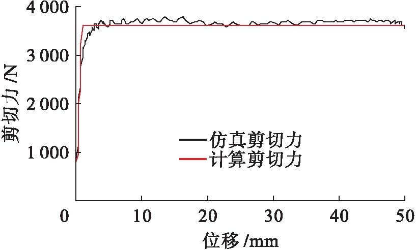 为了验证有限元分析的可靠性,将仿真结果与公式计算结果进行对比分析,结果如图10所示.履带板受到的剪切力在较小位移时快速上升到达顶点,仿真剪切力要稍小于计算剪切力,可以认定仿真有效.