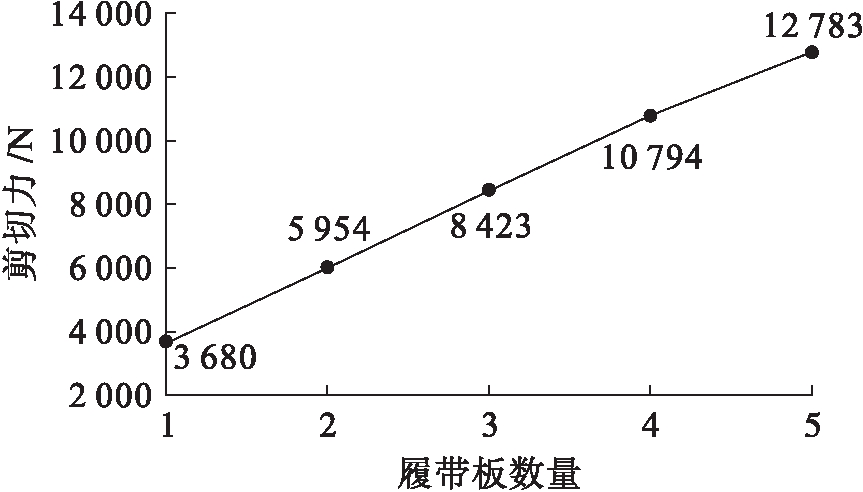 由图12可知,随着履带板数量的增加,剪切力也随之增加,增幅约为60%.因此整车的受力为