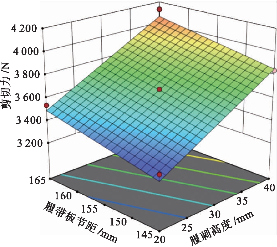 对实验进行方差分析,结果如表4所示.由方差分析可知,履刺高度、节距对剪切力的影响最为显著,履带板的拔模角度对履带板的剪切力影响较小.图14为Box-Behnken实验响应图.将显著性因素作为自变量,剪切力作为响应值,随着履刺节距和履刺高度的增加,履带的剪切力也不断增加,履带板受到的剪切力与履刺高度、履带板节距呈正相关.