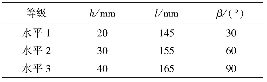 等级h/mml/mmβ/(°)水平12014530水平23015560水平34016590