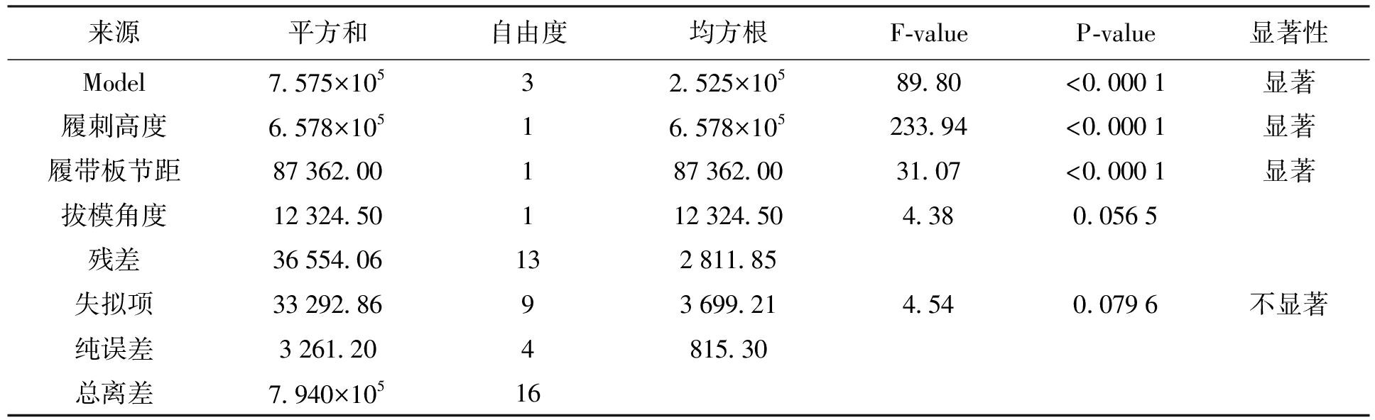 来源平方和自由度均方根F-valueP-value显著性Model7.575×10532.525×10589.80<0.0001显著履刺高度6.578×10516.578×105233.94<0.0001显著履带板节距87362.00187362.0031.07<0.0001显著拔模角度12324.50112324.504.380.0565残差36554.06132811.85失拟项33292.8693699.214.540.0796不显著纯误差3261.204815.30总离差7.940×10516
