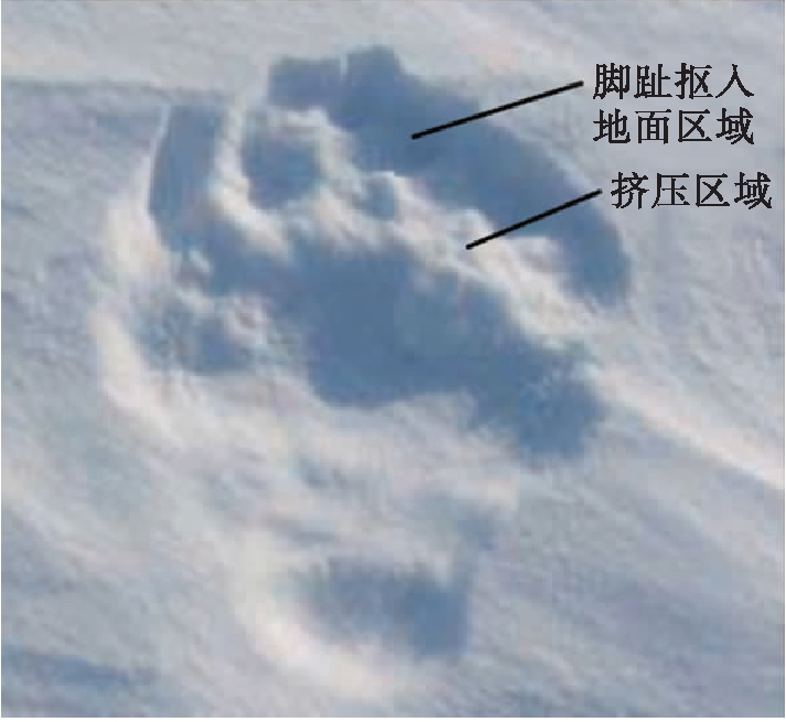 自然界很多动物都拥有在复杂道路上行走的能力,这得益于它们特殊的足部结构[11].北极熊是一种生活在北极的世界最大食肉动物之一.北极熊拥有在冰雪路面上快速奔跑的能力,这也源于它们特殊的足部结构.北极熊的熊掌宽超过25 cm,爪子长度可达10 cm.当北极熊在冰雪路面上行走时,尖锐的脚趾会插入坚硬的积雪中,积雪在挤压区域内聚集,有利于增大北极熊脚掌的牵引力,北极熊脚印如图1所示.