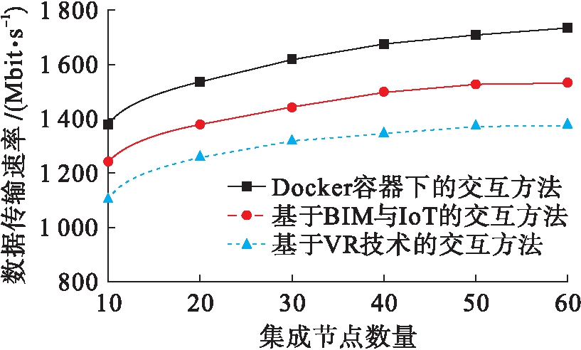 不同集成节点数量下,Docker容器下的交互方法数据传输速率高于1 410 Mbit/s,相较于对比的2种方法而言,传输速率更高.其主要原因是Docker容器下的交互方法通过计算高速总线系统发送的通信数据量,给出通信数据采集的最大化约束条件,利用高速总线节点接收通信数据量与跳数的关系,将通信数据采集指令转换为数据采集最短路径问题,提高了传输速率.