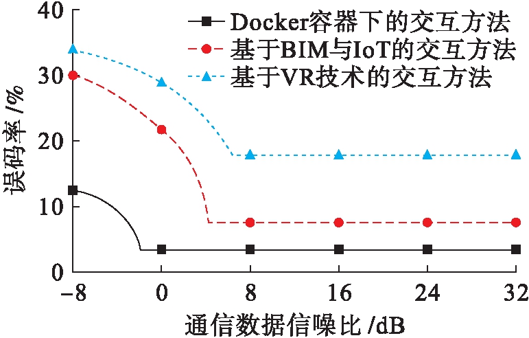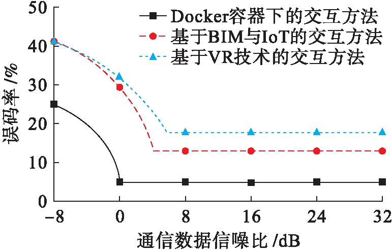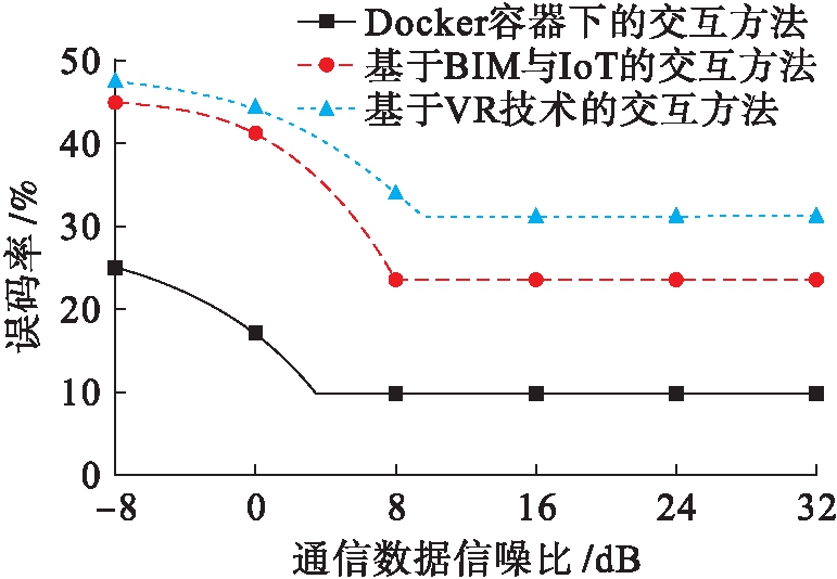 从图1可以看出,在单脉冲干扰下,当通信数据信噪比为-8 dB时,基于VR技术的交互方法和基于BIM与IoT的交互方法得到的误码率是相同的,但是随着通信数据信噪比的增加,基于BIM与IoT的交互方法得到的误码率在迅速下降,当通信数据信噪比为5 dB时,误码率达到最低值;而Docker容器下的交互方法在测试初期得到的误码率为25%,比其他两种方法的误码率低,当通信数据信噪比为0 dB时,通信数据误码率达到了最低值4%,可以看出,所提交互方法得到的通信数据质量更高.