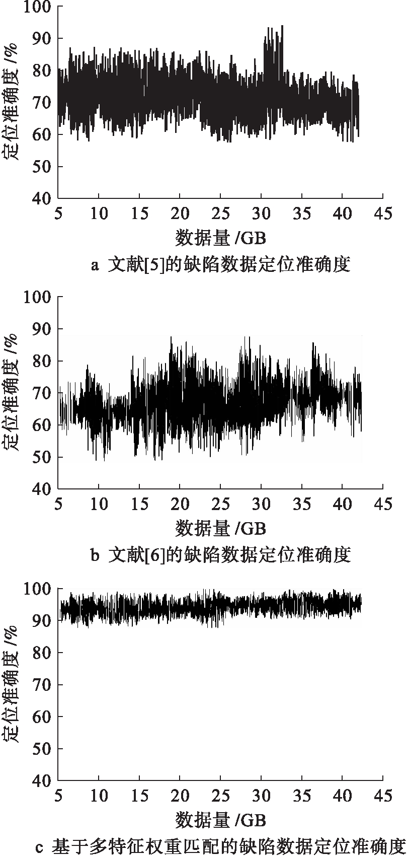 由图4可知,文献[5]的缺陷数据定位准确度约为75%,文献[6]的缺陷数据定位准确度约为65%,而本文所提基于多特征权重匹配的缺陷数据定位准确度约为95%,并且较为稳定.由实验结果可知,本文方法应用多权重特征分配模型,能够准确提取缺陷数据的特征权重,进而准确提取曲线数据,该结果充分证明本文方法的优势,具有较高的实用性.