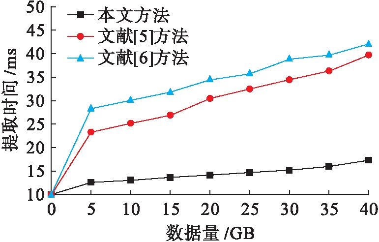 采用不同方法提取40 GB数据中的缺陷数据,并记录提取时间,得到本文方法、文献[5]方法与文献[6]方法提取相同缺陷数据所需的时间比较结果,如图5所示.