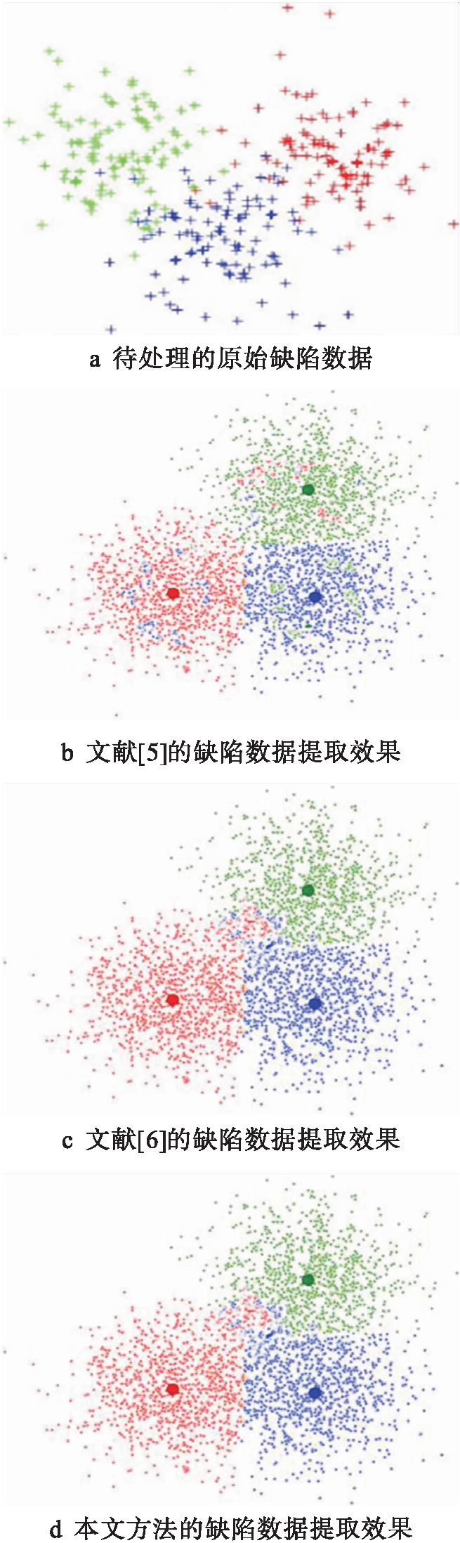 分析图5可以看出,在缺陷数据逐渐增加的情况下,不同方法的提取时间也逐渐增加.文献[5]方法和文献[6]方法的提取时间分别为36.5 s与39 s;而本文方法的提取时间为17.5 s.本文方法采用K均值聚类算法,根据多特征权重特征分布完成量化融合跟踪,提升了缺陷数据提取准确率,同时也提高了提取速度.实验结果表明,本文方法和传统方法相比提取效率大大增加,验证了本文方法的高效性.