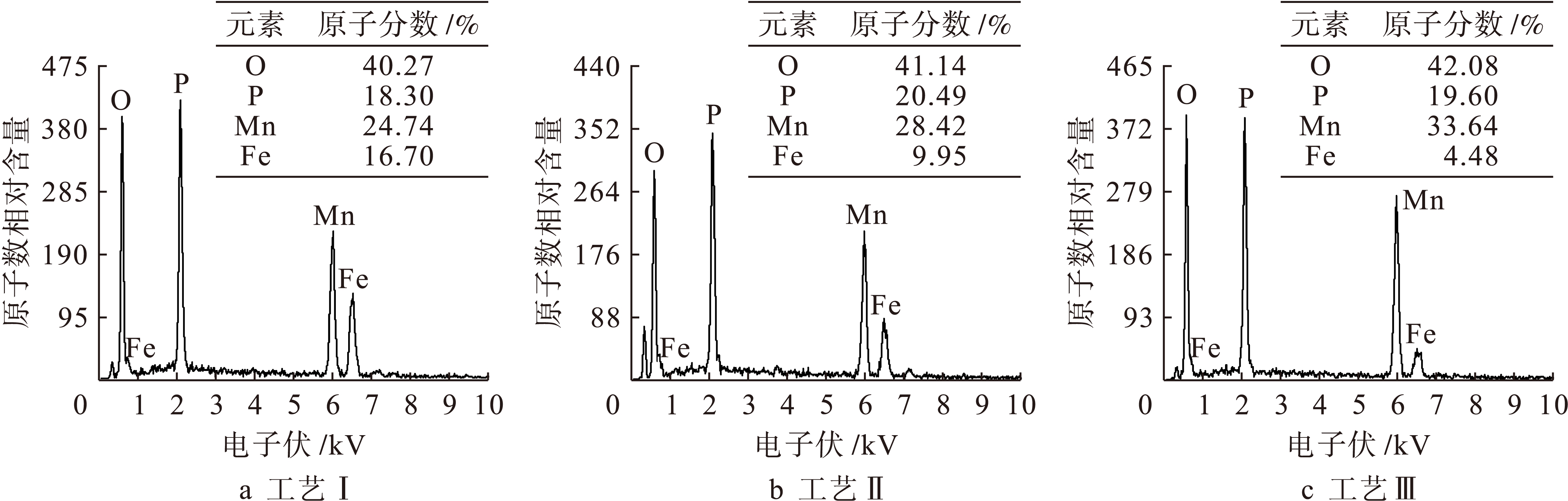晶粒成核阶段,难以使磷化膜晶粒充分生长成膜.工艺Ⅱ条件下,磷化膜由细小的短棒状结晶晶粒堆积组成,其组织致密均匀,具有良好的覆盖性.磷化膜结晶晶粒生长较为充分,尺寸约为3~5 μm.随着磷化液总酸度和游离酸度的增加,酸比比值降低,磷化体系反应速率加快,促进了40NiCrMo7钢表面磷化过程的结晶形核,提升了成核速率及生长速率,从而使得磷化晶粒紧密堆积成膜.在工艺Ⅲ条件下,磷化膜表面变得疏松粗糙不平,磷化膜结晶晶粒粗大,尺寸显著增大至10 μm以上,同时磷化膜内孔隙增加.此时由于磷化液总酸度及游离酸度较高,40NiCrMo7钢表面的腐蚀速率加快,磷化过程反应剧烈,释放出氢气,这些氢气依附在40NiCrMo7钢表面,阻碍了某些磷化物进一步沉积,从而为其他晶粒的生长提供充足的空间,所得磷化膜结晶组织相对疏松.从图2相对应的EDS分析可以看出,锰系磷化膜主要包含O、P、Mn和Fe元素.Mn元素含量随着磷化液浓度的升高而上升,同时Fe元素含量随之下降.