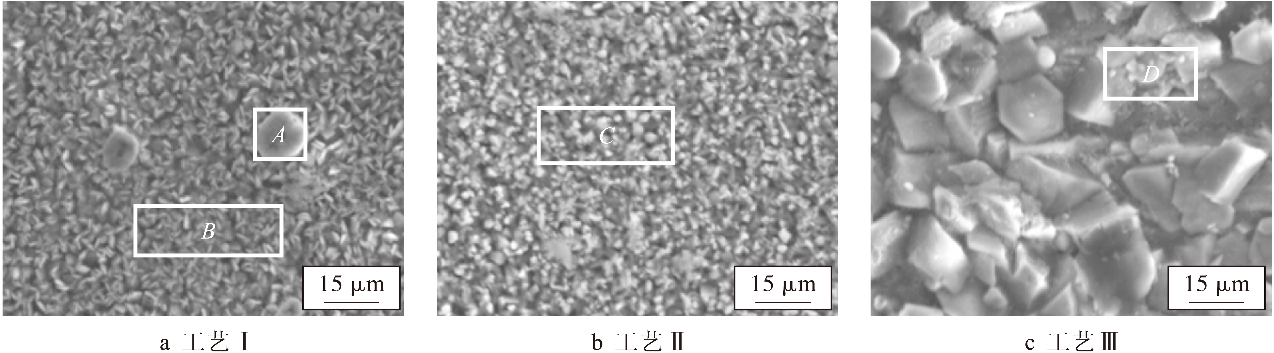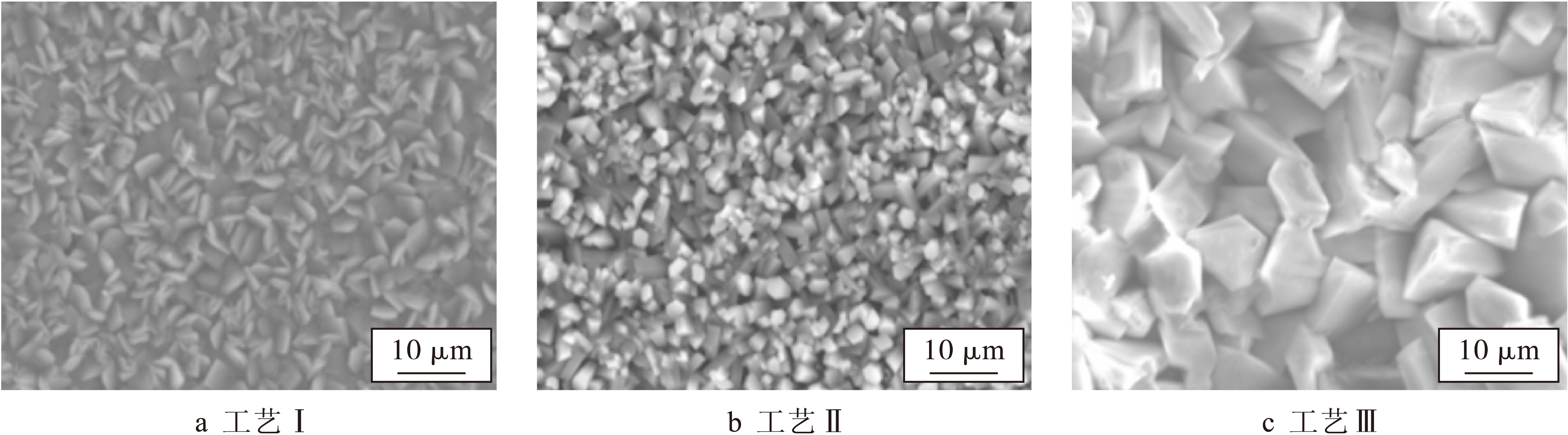 图1为磷化膜表面组织形貌,由图可以看出,工艺Ⅰ条件下,磷化膜层较薄且未生长完全,覆盖不够完整,部分区域存在基材裸露现象,磷化膜晶粒结晶疏松且晶粒尺寸不均,呈细小的针片状,平均尺寸为3 μm.此时由于总酸度和游离酸度较低,酸比比值较高,磷化体系反应速率较慢,长时间处于基体溶解