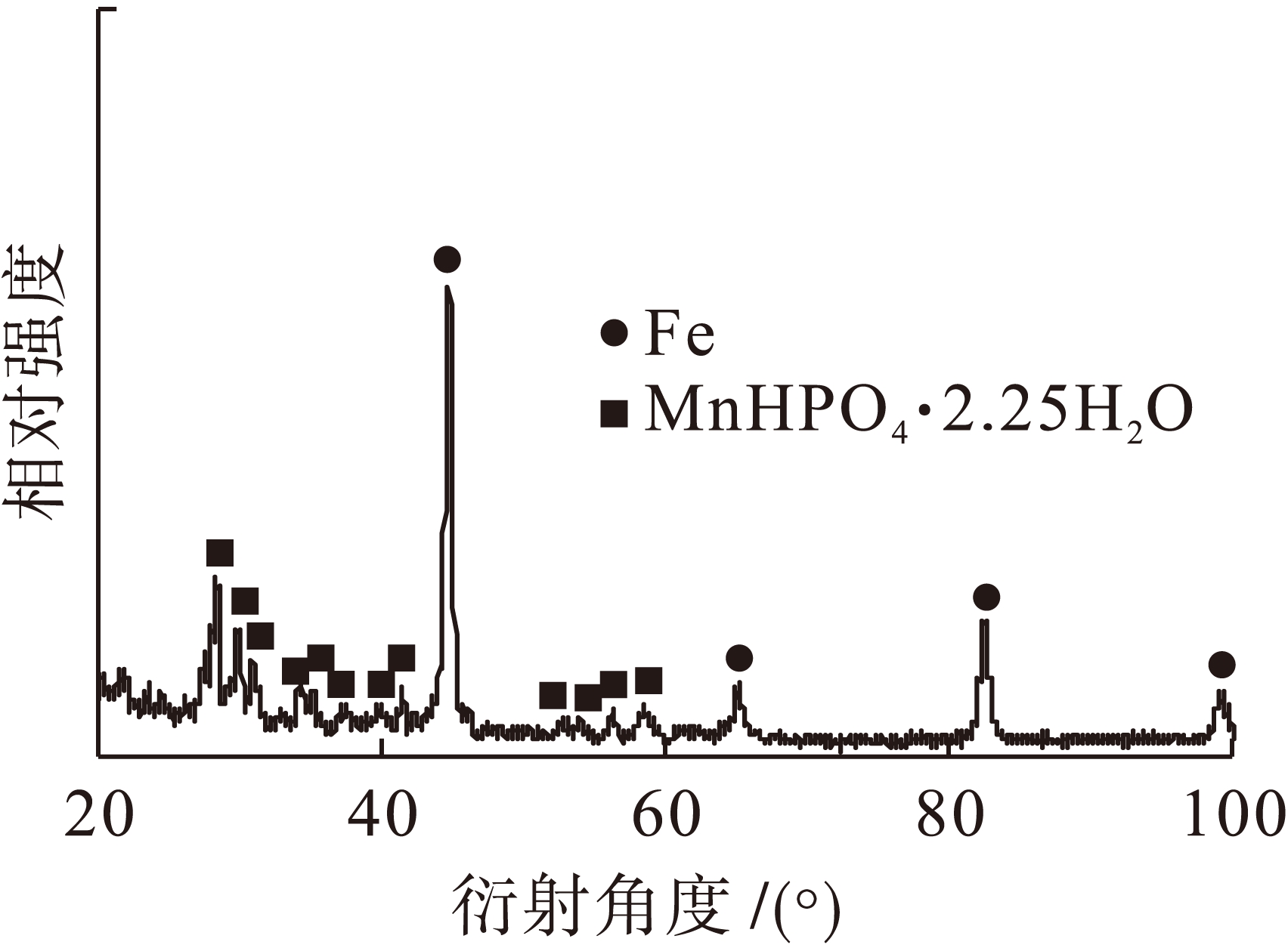 图3为工艺Ⅱ条件下锰系磷化膜X射线衍射谱,可以看出磷化膜主要由MnHPO4·2.25H2O构成.另外,由于磷化膜层较薄,在检测过程中X射线将磷化膜击穿,从而出现了明显的Fe基体衍射峰.
