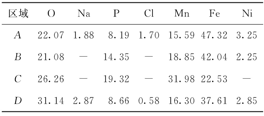 表3 磷化膜盐雾腐蚀240 h后的EDS结果(原子分数)