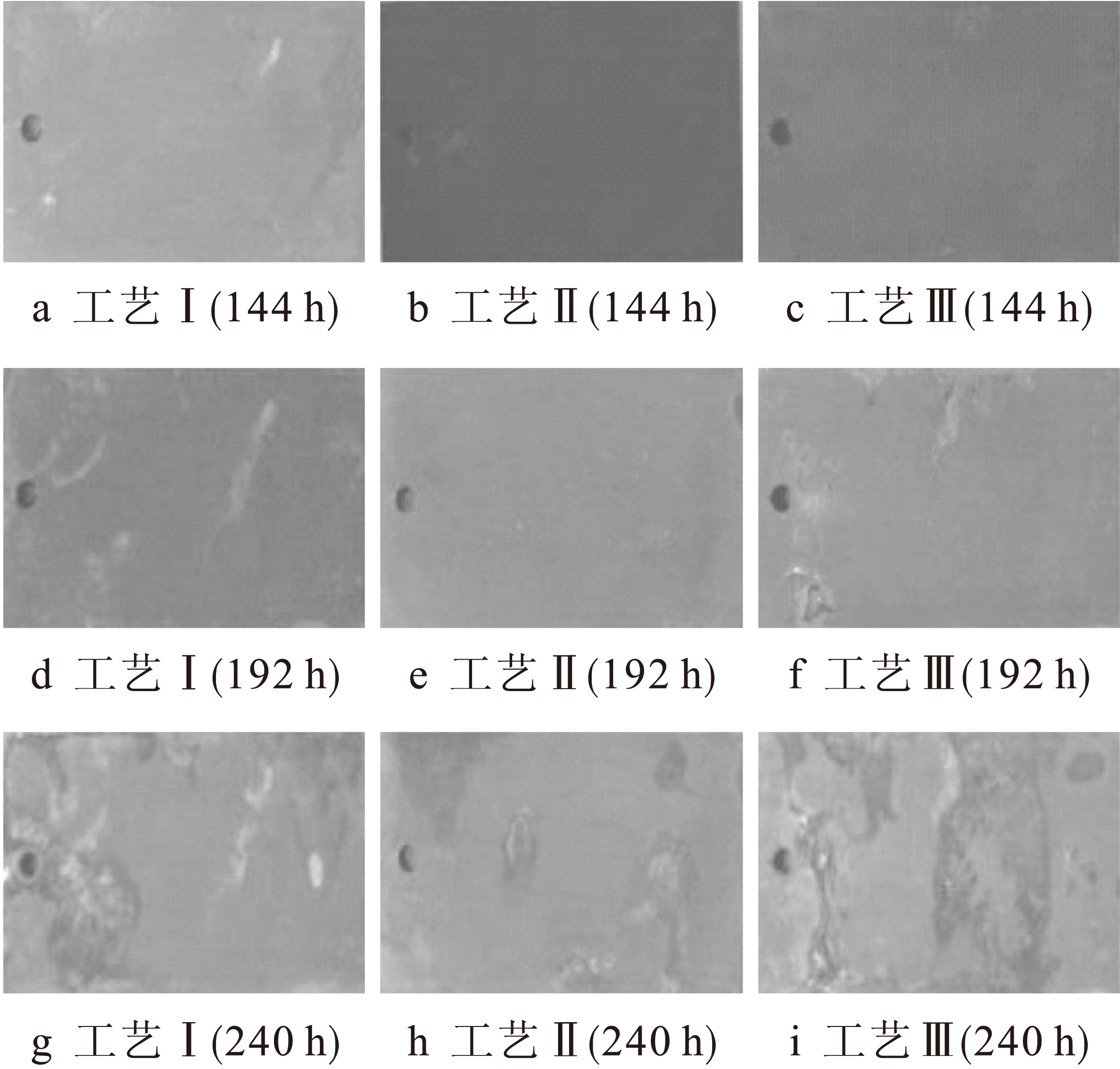 图4为锰系磷化膜盐雾腐蚀样品表面宏观形貌.当盐雾试验进行144 h时,三种工艺磷化膜表面仍保持洁净,无锈蚀发生.随试验时间的延长,工艺Ⅰ磷化膜表面最先开始出现腐蚀,面积约为0.5%,工艺Ⅱ样品表面依然洁净如初,工艺Ⅲ磷化膜表面出现明显锈蚀,腐蚀面积为1%.当盐雾腐蚀进行240 h后,三种磷化膜表面均存在不同程度锈蚀现象,各磷化膜表面腐蚀面积分别为3%,1%及5%.