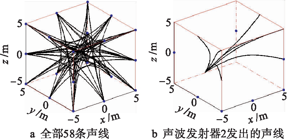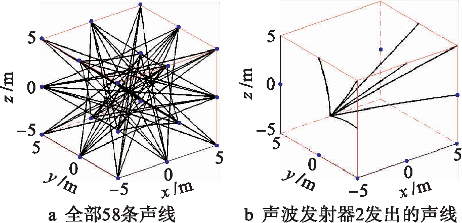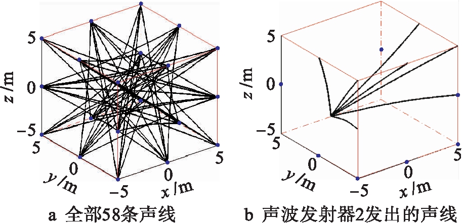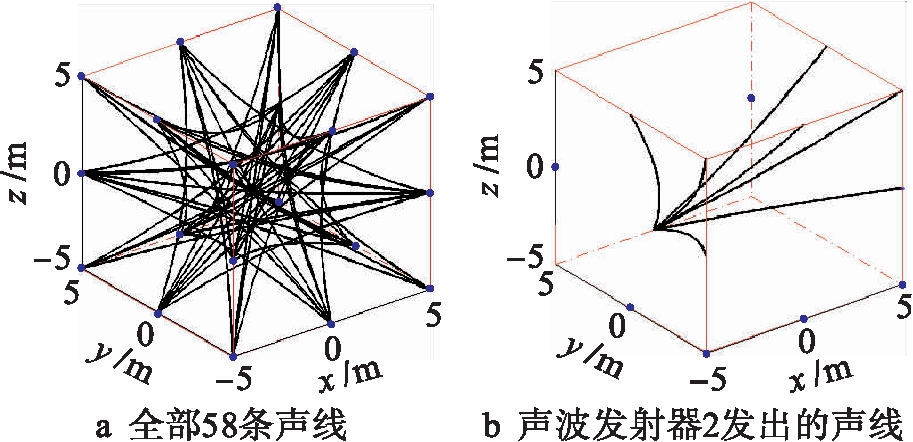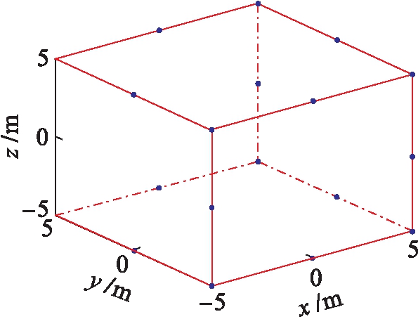 本文所考虑的被测区域为10 m×10 m×10 m的正方体区域,周围布置20个声波发射/接收器,如图2所示.其中,蓝色圆点表示声波发射/接收器,红线表示区域边界.