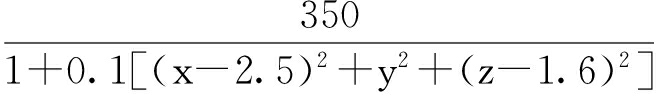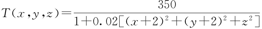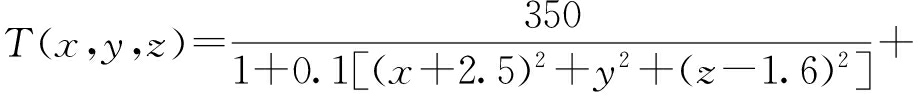 T(x,y,z)=293+50e-0.09[(x-3)2+y2+(z-0.6)2]+