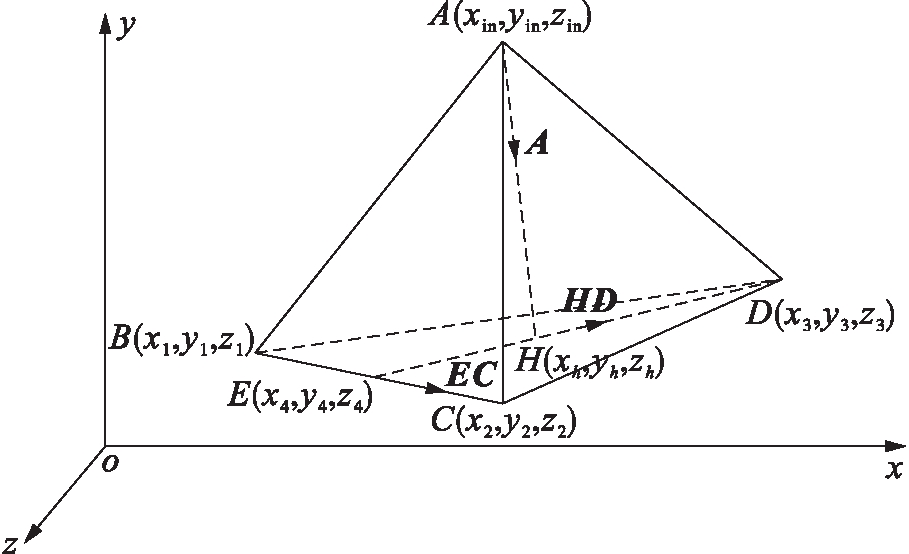 设声线入射点坐标为A(xin,yin,zin),入射方向为A(Ax,Ay,Az).以A为顶点,AH(长度为h、方向与A(Ax,Ay,Az)一致)为高作一正三棱锥,如图1所示.图1中,平面AHD垂直于平面xoz,以H到D为方向的单位矢量为HD(HDx,HDy,HDz),以E到C为方向的单位矢量为EC(ECx,ECy,ECz).存在向量关系,即EC=A×HD=(AyHDz-HDyAz,AzHDx-HDzAx,AxHDy-HDxAy).由此可求出正四面体其余顶点B、C、D的坐标.