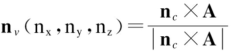 由正三棱锥的四个顶点A、B、C、D的坐标及其顶点对应的声速值Gin、G1、G2、G3可以确定系数a、b、c、d.式(1)所描述的线性声速场的等声速面是由nc(a,b,c)为法线向量的平面族构成.入射点A所在的等声速面nc和A共同决定了声线轨迹所在的平面,其法向单位矢量为