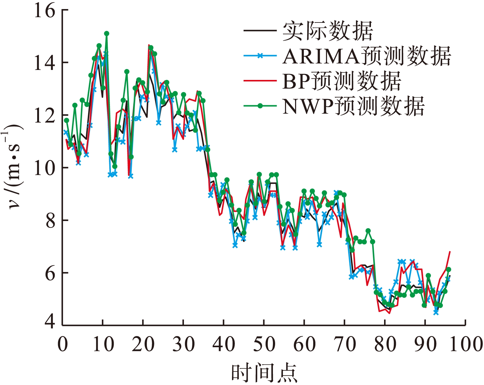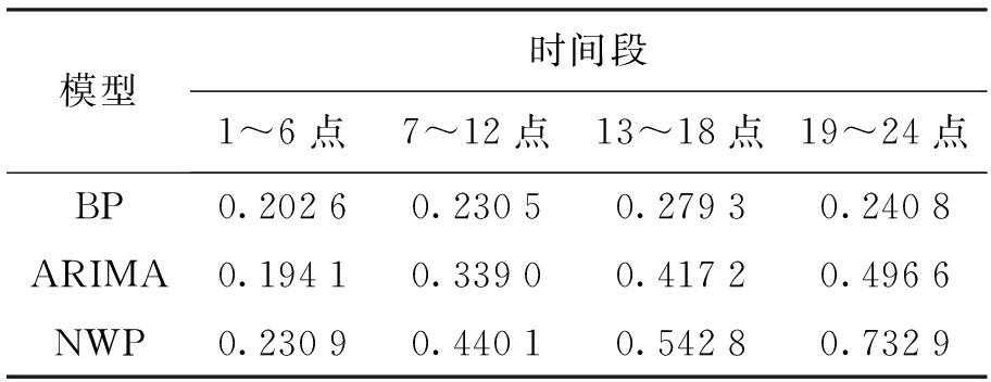 ARIMA对1~6点的超短期风速预测精度较高,随着预测时间增加,预测误差越来越大;BP整体的预测精度优于ARIMA和NWP,但并非一直如此,预测时间短的情况下,ARIMA误差小于BP,随着时间增长,神经网络的优越性越加显示出来;NWP的预测精度也是随着时间的增加而降低.