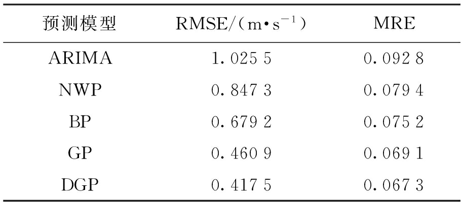 上述5种模型预测结果分别为RMSE NWP=0.486 7 m/s>RMSE ARIMA=0.361 7 m/s>RMSE BP=0.238 3 m/s>RMSE GP=0.194 1 m/s>RMSE DGP=0.187 9 m/s,MRE NWP=0.063 1>MRE ARIMA=0.041 1>