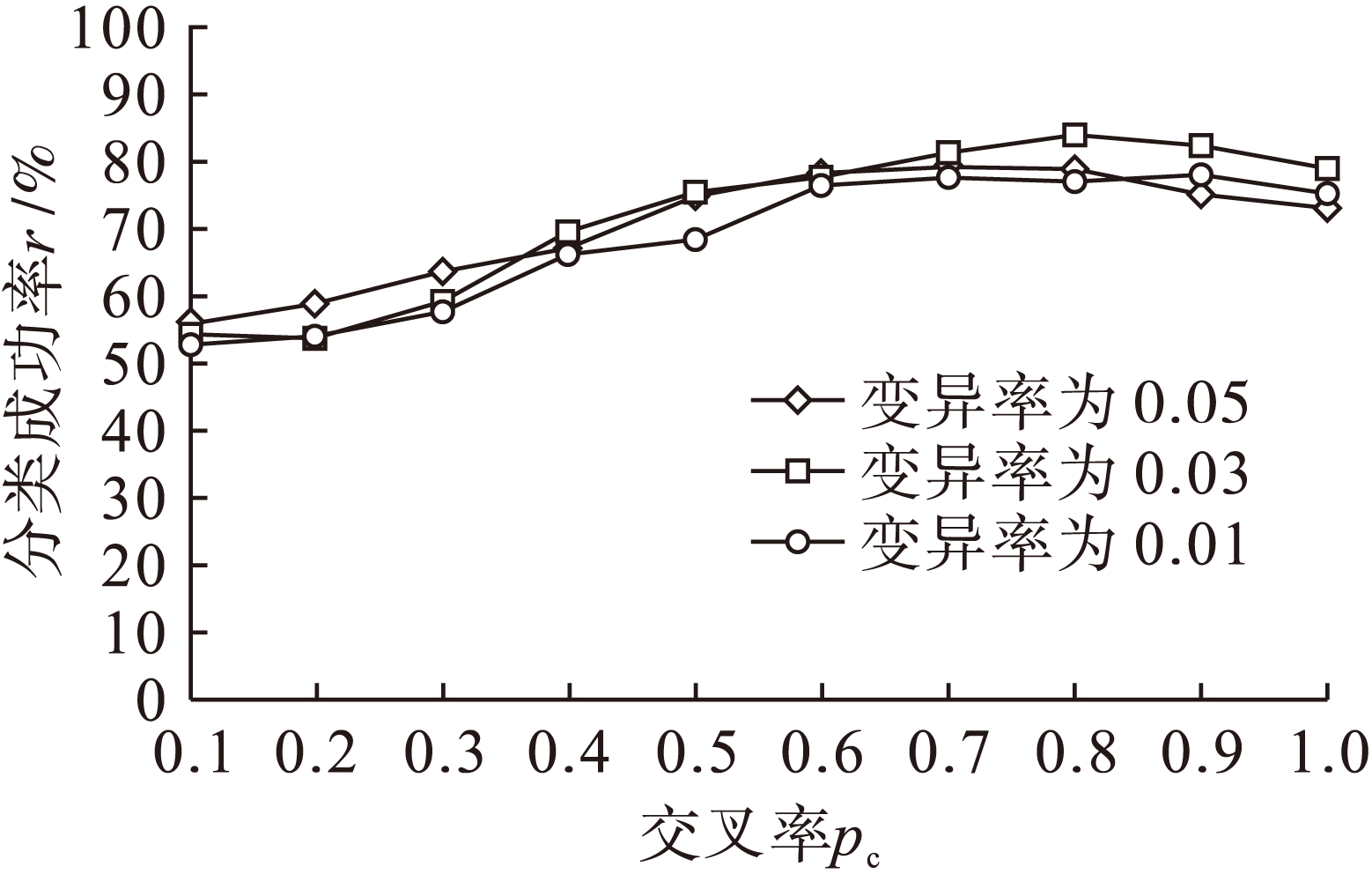 2) 交叉率 p c、变异率 p m与分类成功率 r的关系.图5为取 N Ab k =50, T=20,不同变异率 p m时,交叉率 p c与分类成功率 r之间的关系曲线.