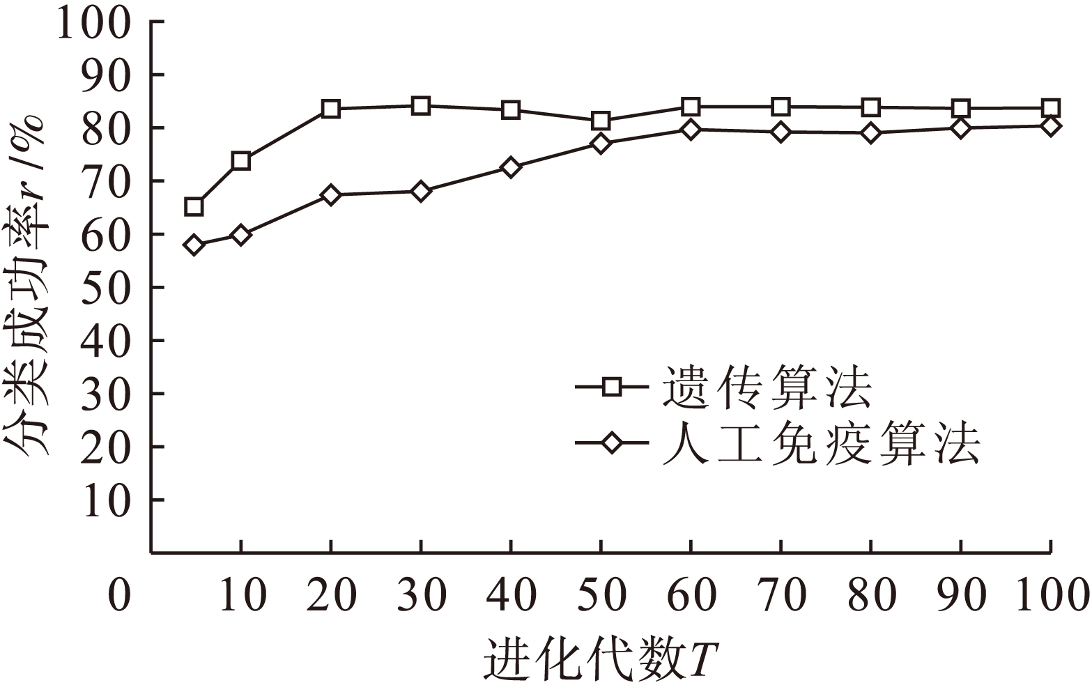 本算法与Chen算法分类成功率对比如图4所示.取抗体群体规模 N Ab k 为50,本文算法从第5到20代时, r从65%增加到84%,进化代数 T继续增加, r基本不变,本文算法分类成功率较高.由于使用多父体交叉,使父代个体在大范围内交换有利信息,使每一代进化更有效,更快速地产生优良抗体,且不受个体维数的影响.而Chen的算法由于变异的不确定性,优良模式不能得到充分利用,进化代数增加.
