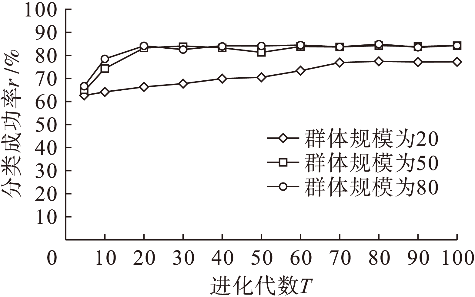 1) 抗体群体规模 N Ab k 、进化代数 T与分类成功率 r的关系.取 p c=0.8,抗体群体规模 N Ab k 分别为20、50、80时,进化代数 T与分类成功率 r的关系如图3所示.当 N Ab k 为20时,群体信息量不充分, T为100代后仍不能达到理想 r值;而当 N Ab k 为50时,由于使用多父体交叉,进化过程能有效利用已有优良模式,尽可能增加抗体的多样性,且避免了近亲繁殖,大大增加了收敛速度,当进化20代时, r就能达到84%左右;当 N Ab k 为80时,20代以前群体进化速度快,但后期 r与 N Ab k 为50时基本一致,但过大的群体规模将导致算法求解时间长,效率低.