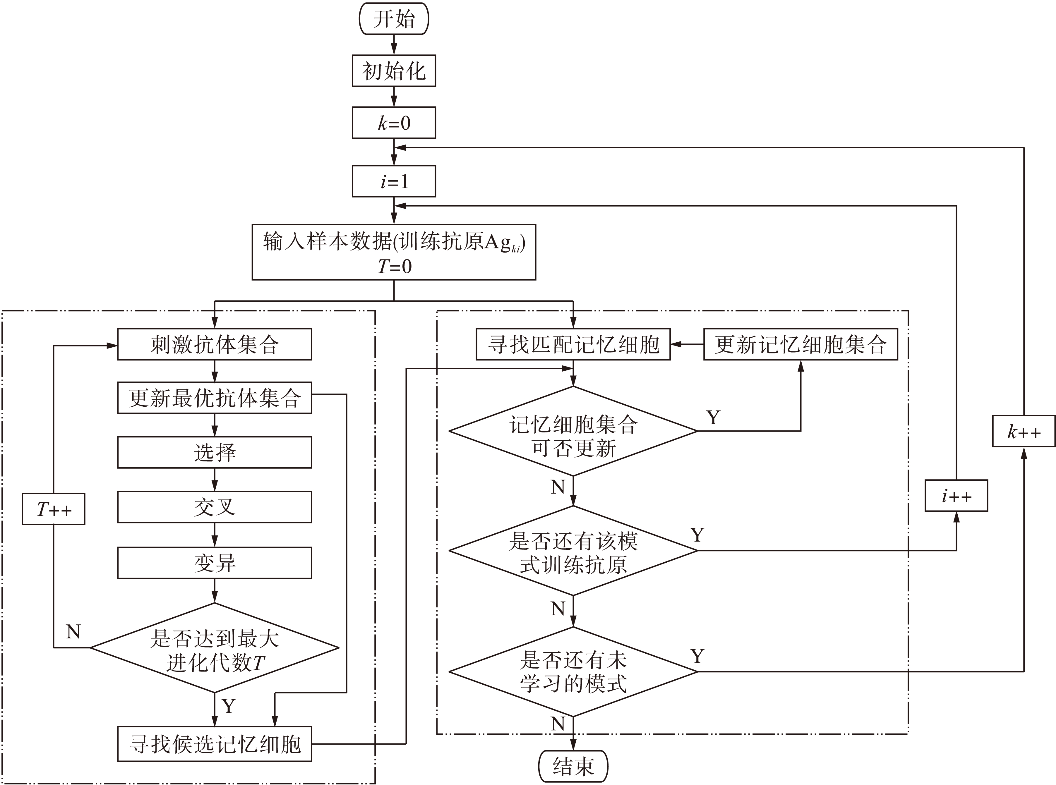 记忆细胞集合更新规则为:如果( R ms(Mc ki , S Mc k )> τ)∪(aff(Mc ki ,Ag kj )>aff(Mc match. ki ,Ag kj )),则从记忆细胞集合 S Mc k 中随机删除一个记忆细胞,然后将候选记忆细胞Mc ki 加入到记忆细胞集合 S Mc k 中;否则,记忆细胞集合 S Mc k 不发生改变.式中, τ∈(0,1)为候选记忆细胞替换阈值.