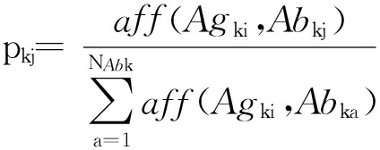 3) 选择.本文采用确定性采样选择方法,设抗体Ab kj 被选择概率为 p kj ,则其生存数目为