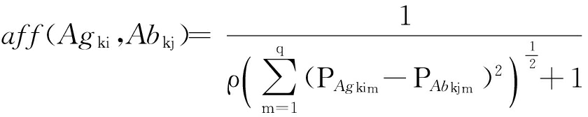 式中, ρ为亲和力系数, ρ∈(0,1].由式(1)可见,亲和力越大,抗体与抗原特征向量的距离越小,二者也就越匹配.