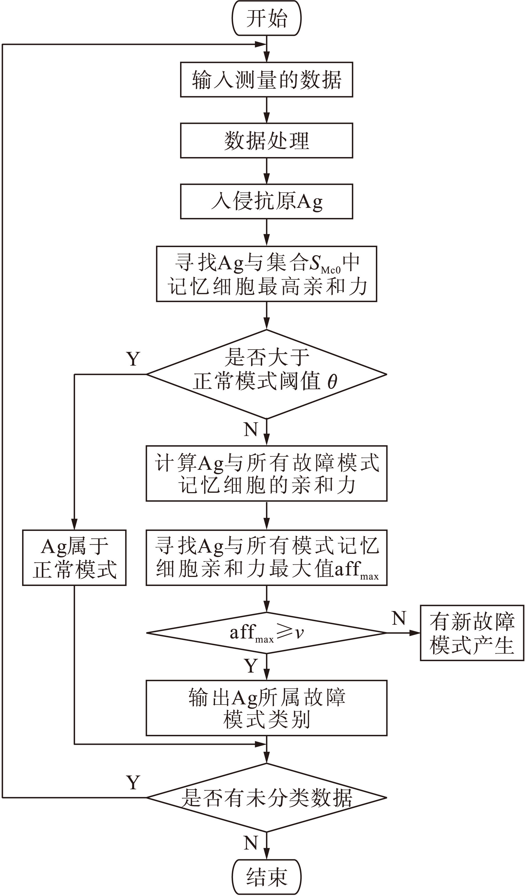 如果aff max≥ v,则该数据所属模式 k m 为与其产生最高亲和力的记忆细胞所属的模式,即 k m =arg{aff max},式中, v为新模式阈值;否则,表明出现新的故障模式,进行报警.