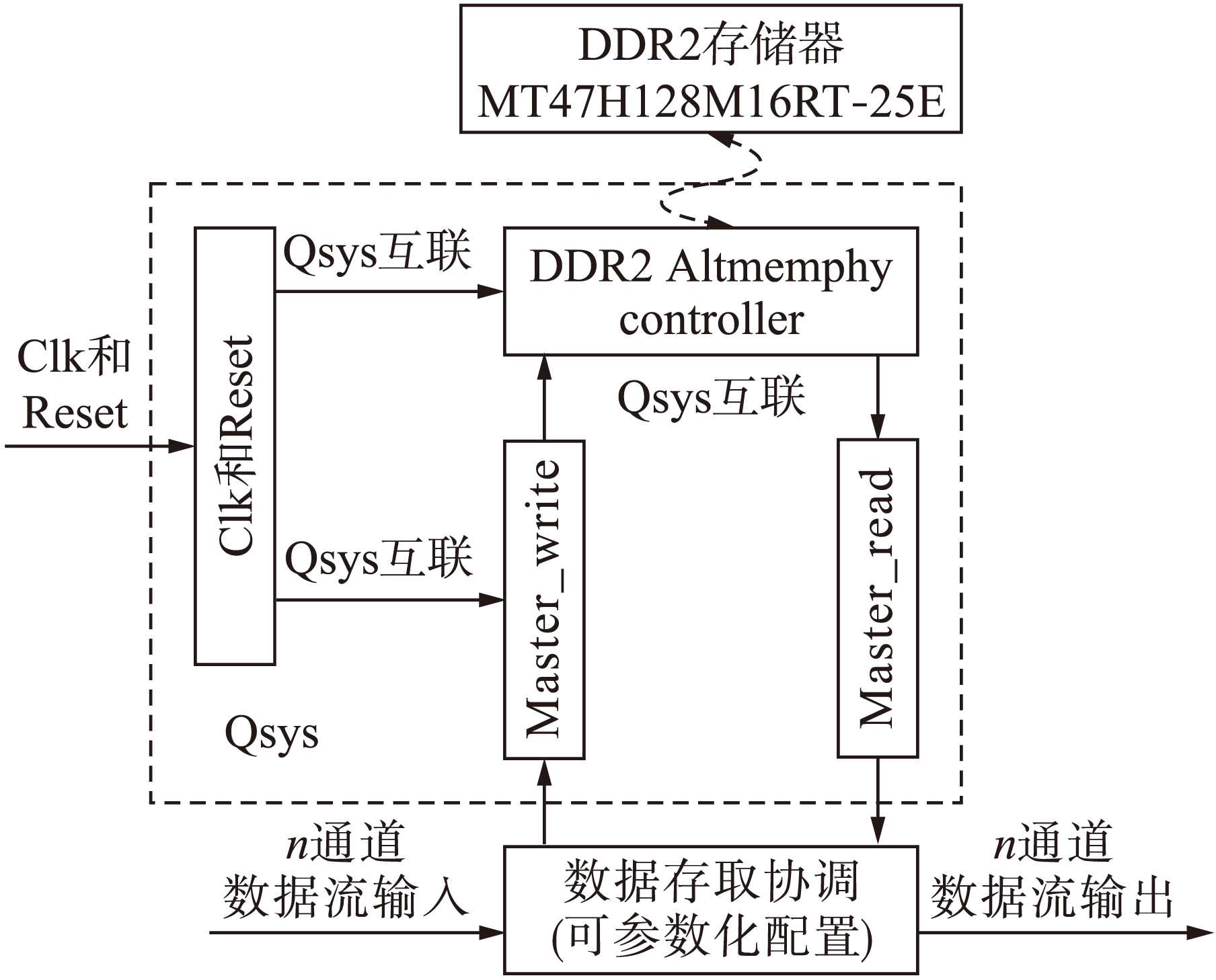 图3为改进设计关键部分框图,结合系统改进设计原理可知,关键的模块是Qsys中的Altmemphy控制器IPcore、主动写IPcore、主动读IPcore和数据存取协调的相互配合设计,其中Clk和Reset模块为Qsys系统互联设计提供必要的时钟和复位信号.相对于传统的设计方法,该设计的优越性体现在采用了Qsys提供的强大系统互联架构,一方面,该架构将很大程度上简化Altmemphy控制器IPcore用户接口与数据存取协调模块的互联,采用了Qsys提供的avalon-MM Master IPcore完成Altmemphy控制器IPcore与存取协调模块的桥接;另一方面,该架构中采用avalon-MM Master IPcore具备强大的系统兼容性,用户只需考虑IPcore与外设接口的设计以及存取协调模块的参数化配置.该改进设计方法可轻松移植到其他类似存储器的设计中,例如PCI、PCIe、SRIO、SDRAM、SRAM及DDR等 [7,9-10].