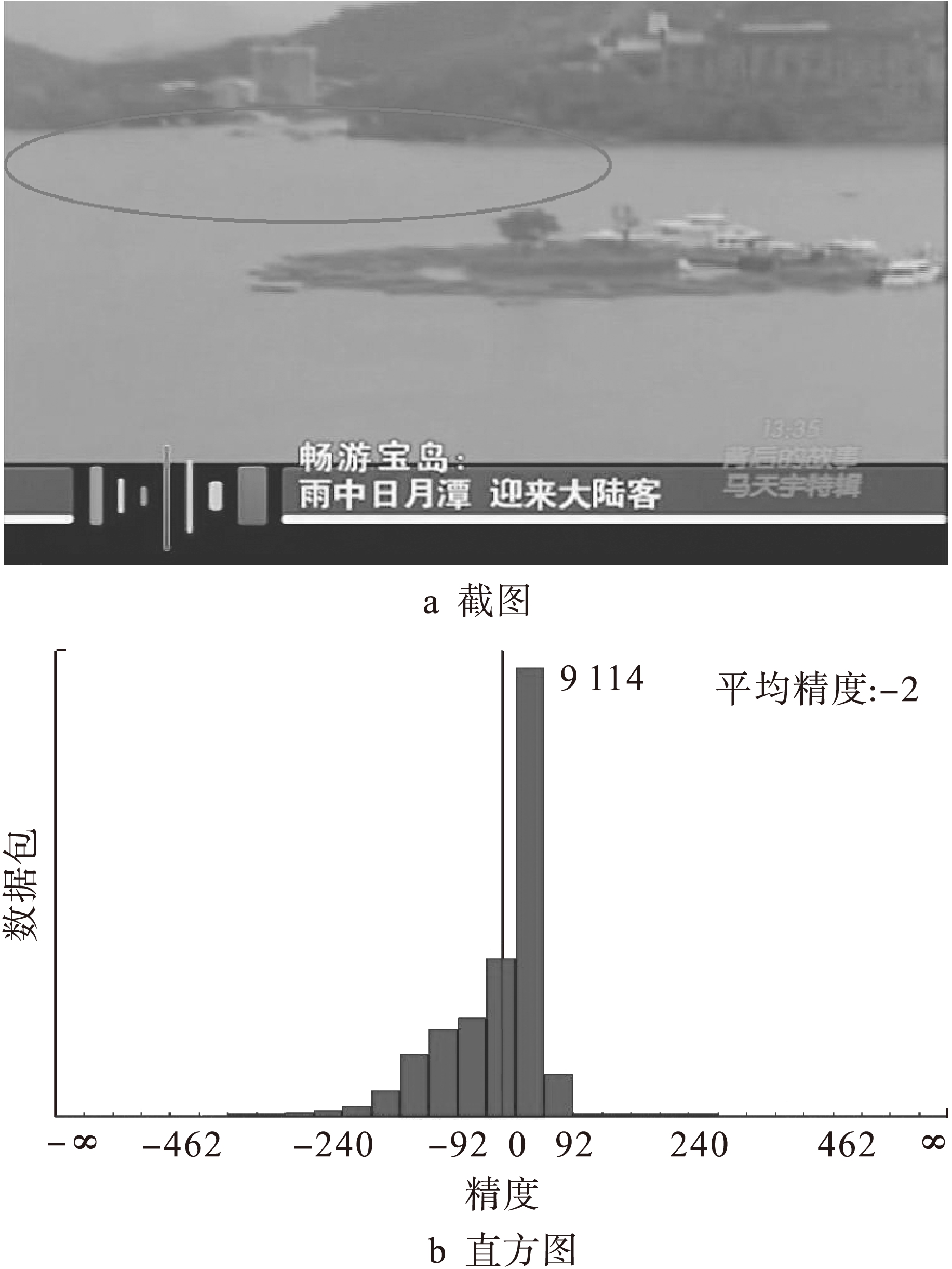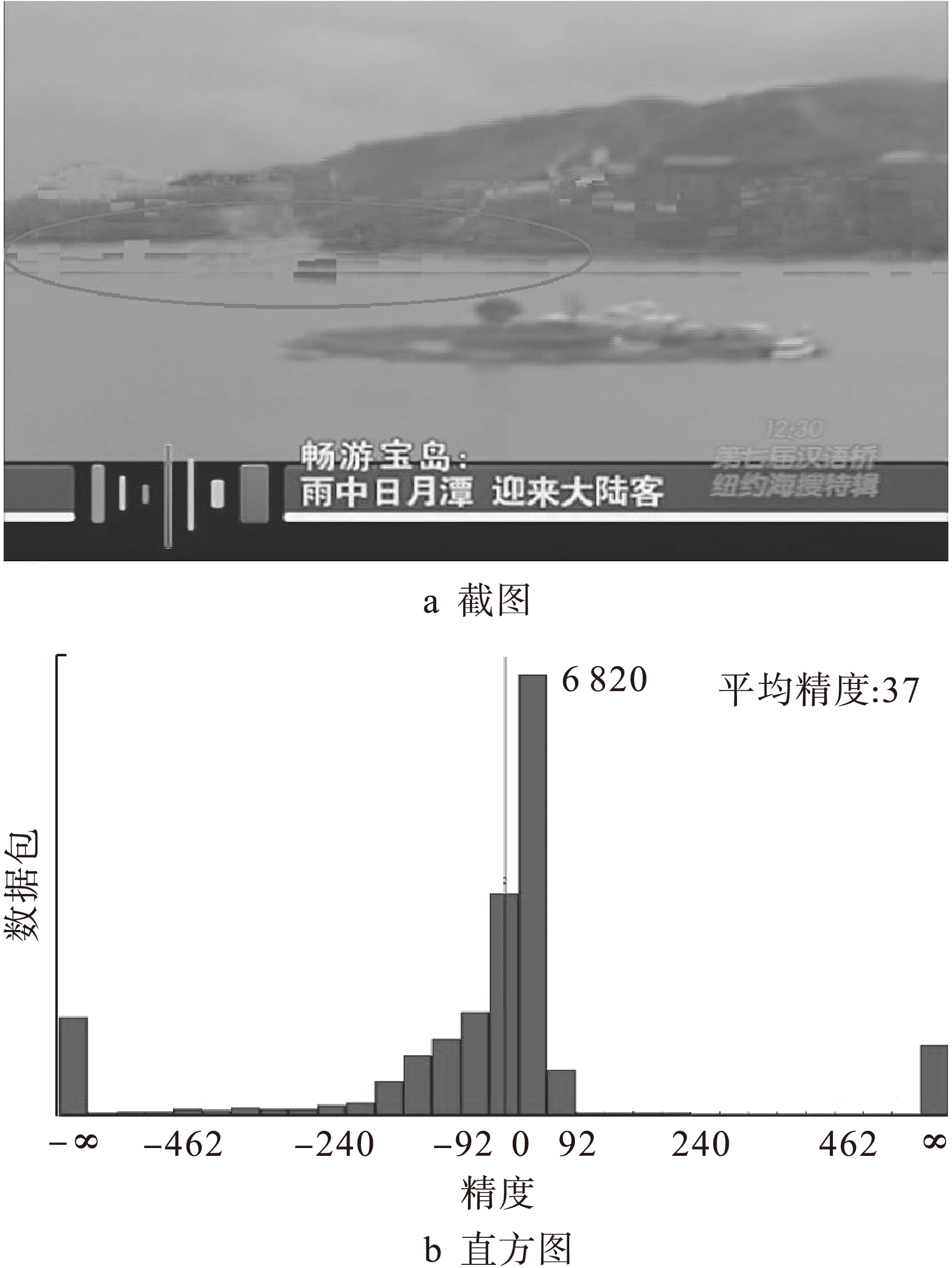 抖动直方图.按照对应的码流速率经码流分析仪播放进行对比,很明显可见图10的图像清晰度和PCR抖动分布均相对于图11较差,图10存在图像重叠现象,而图11无明显不清晰的情况.图10 PCR抖动分布较图11分散,且图11以平均PCR精度-2优于图10平均精度37,在同一精度的最大IP包数中,图11以9 114包多于图10的6 820包.