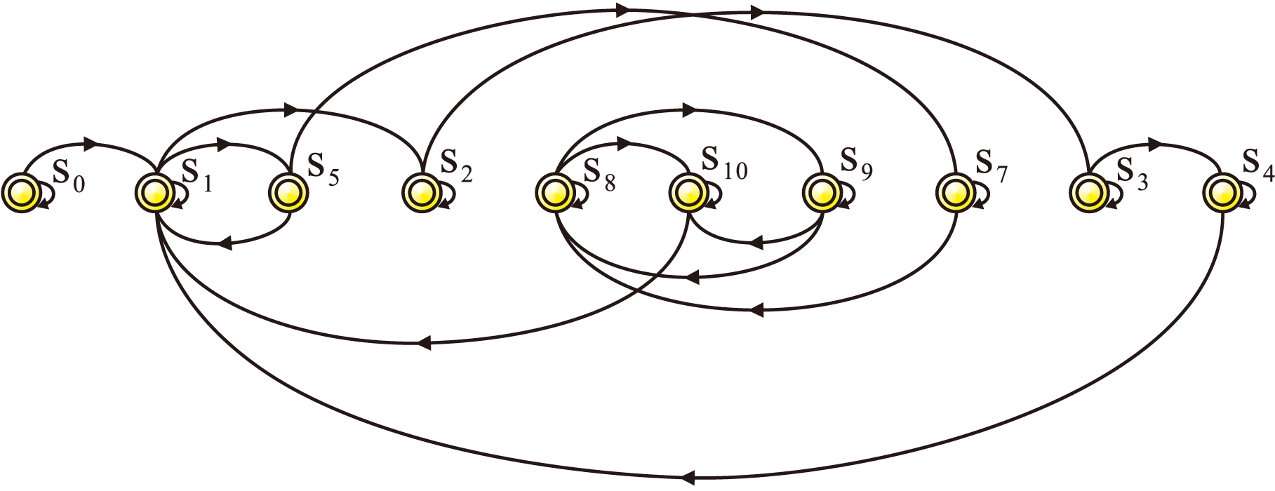 数据协调模块的设计推荐采用状态机来描述,本设计的状态机状态转换图如图6所示.由设计思路结合上图中状态间衔接关系可知,状态S 0为初始状态,主要完成各寄存器的初始化;状态S 1~S 6完成数据输入通道数据的缓存;状态S 7~S 10主要完成已缓存数据的读取输出,各状态间相互配合、衔接共同完成数据协调模块的功能.