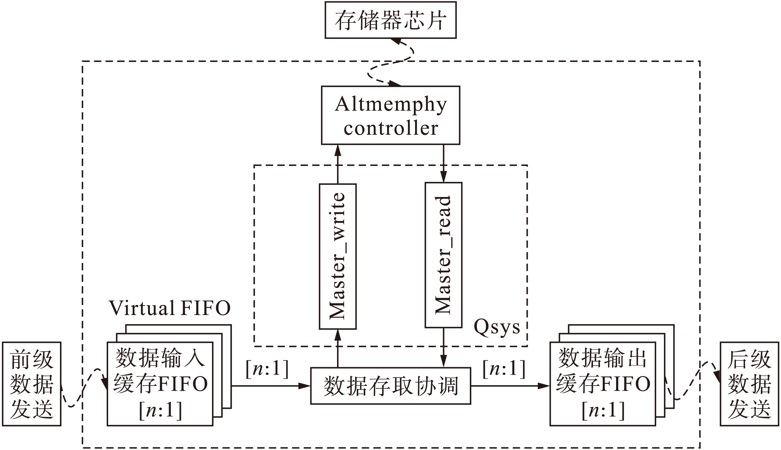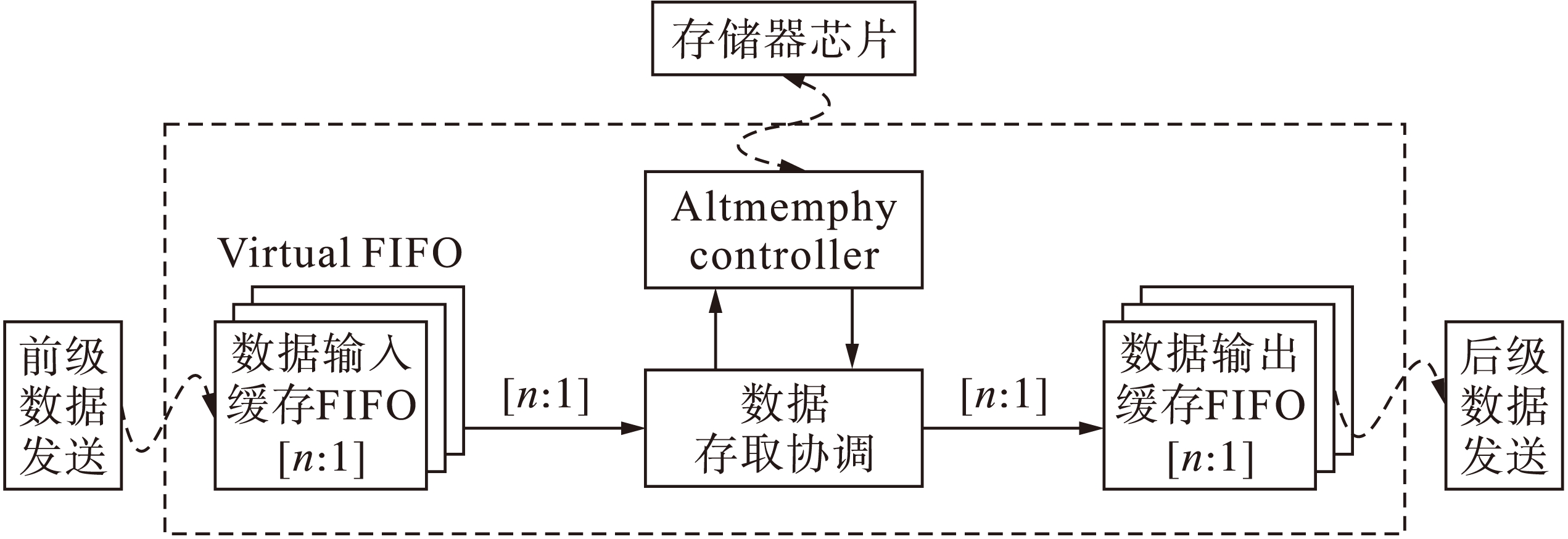 图1中系统结构框图从左往右依次包括 n通道的数据输入缓存FIFO IPcore、数据存取协调及 n通道的数据输出缓存FIFO IPcore,在数据存取协调模块上方是Altmemphy控制器IPcore [5-6].该种设计方法的难点主要在Altmemphy控制器IP和数据存取协调模块的设计,Altmemphy控制器IPcore完成片外存储芯片接口到相对简单的用户接口的转换,数据存取协调模块完成数据输入、输出缓存FIFO接口与Altmemphy控制器IPcore用户接口间数据的协调存取.对于虚拟FIFO设计的外部接口包括专用存储器IPcore接口、标准读或写FIFO数据操作接口,因此用户或开发者完全可将其当作FIFO来进行数据缓存使用.