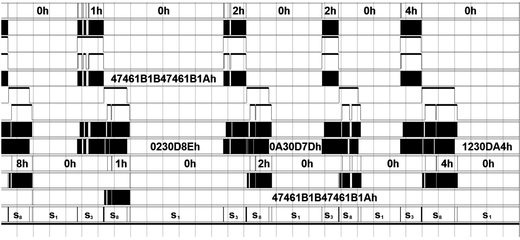图7(图8、9同)中信号定义自上而下依次是:输入FIFO读请求、输入FIFO读数据、本地端写请求、本地端写数据请求、本地端写数据、本地端读请求、本地端读数据有效、本地端读数据、本地端地址、输出FIFO写请求、输出FIFO写数据、状态跳转和校验信号.