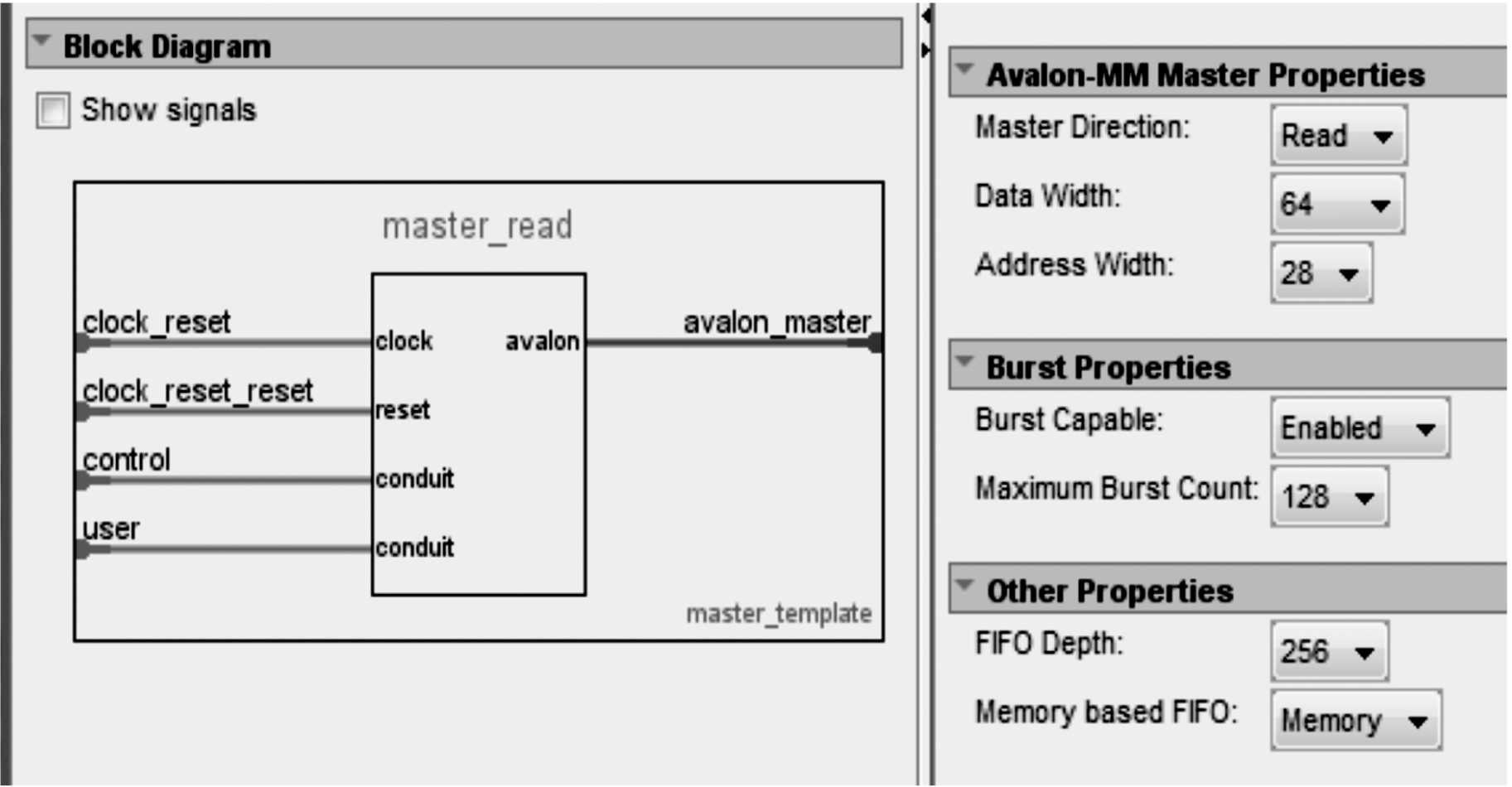 在Qsys设计中会用到Controller with ALTMEMPHY IPcore和avalon-MM Master IPcore,由于Controller with ALTMEMPHY IP针对不同的片外存储器芯片(本设计针对DDR2,因此采用DDR2 SDRAM Controller with ALTMEMPHY IPcore)会使用不同的IPcore进行设计,没有针对性,因此,重点对avalon-MM Master IPcore的Read Master做介绍说明,Write Master类同.