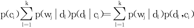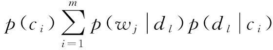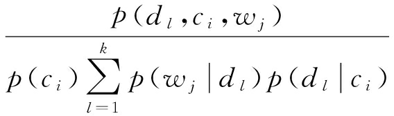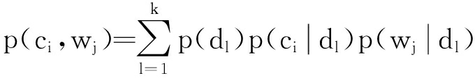 Hofmann提出了一种基于概率模型的隐含语义分析法(PLSA),使用概率模型可以将微信文本和敏感词映射到同一个语义空间中 [20].通过计算信息文本、关键词与语义(兴趣倾向)空间上的夹角来实现近似匹配的量化工作.本文结合微信息交流的特点,将PLSA隐含语义分析法进行了改造,假设隐含语义(主题倾向)序列为 D={ d 1, d 2,…, d k },相应的微信息文本属性空间表示为 C={ c 1, c 2,…, c m },先验性的敏感词空间表示为 W={ w 1, w 2,…, w n }.首先观察( C, W)变量的联合概率与隐含语义 D的关系,文本和敏感词的联合概率表示为