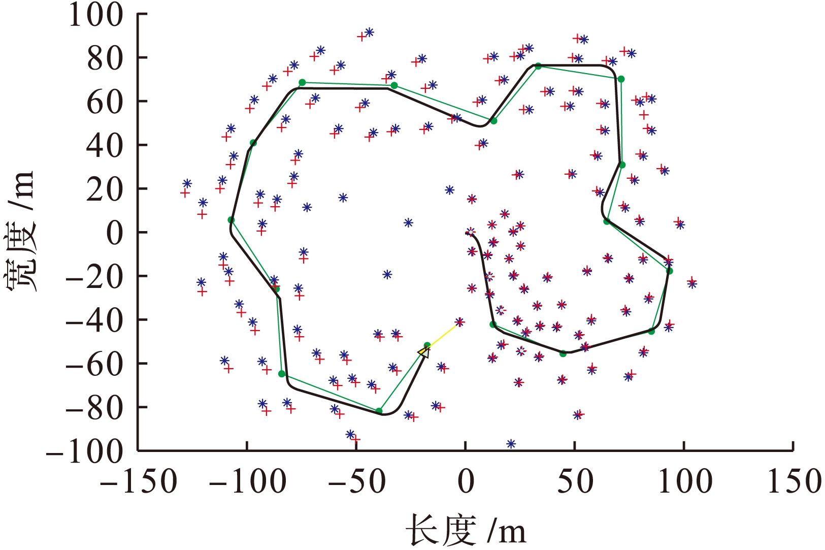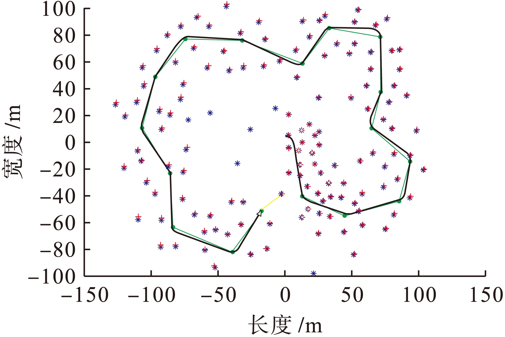 本实验以MATLAB为平台,在Tim Bailey等人提供的EKF-SLAM平台基础上进行程序设计,实现上述算法功能.仿真基于200 m×200 m的室内环境,图1和图2分别为同一环境条件下采用传统算法与本文算法进行实验仿真的小车运动路径(星号为地标的理想位置,加号为经标准卡尔曼滤波算法获得的估计位置,粗线表示机器人估计路径,细线表示机器人预计路径).